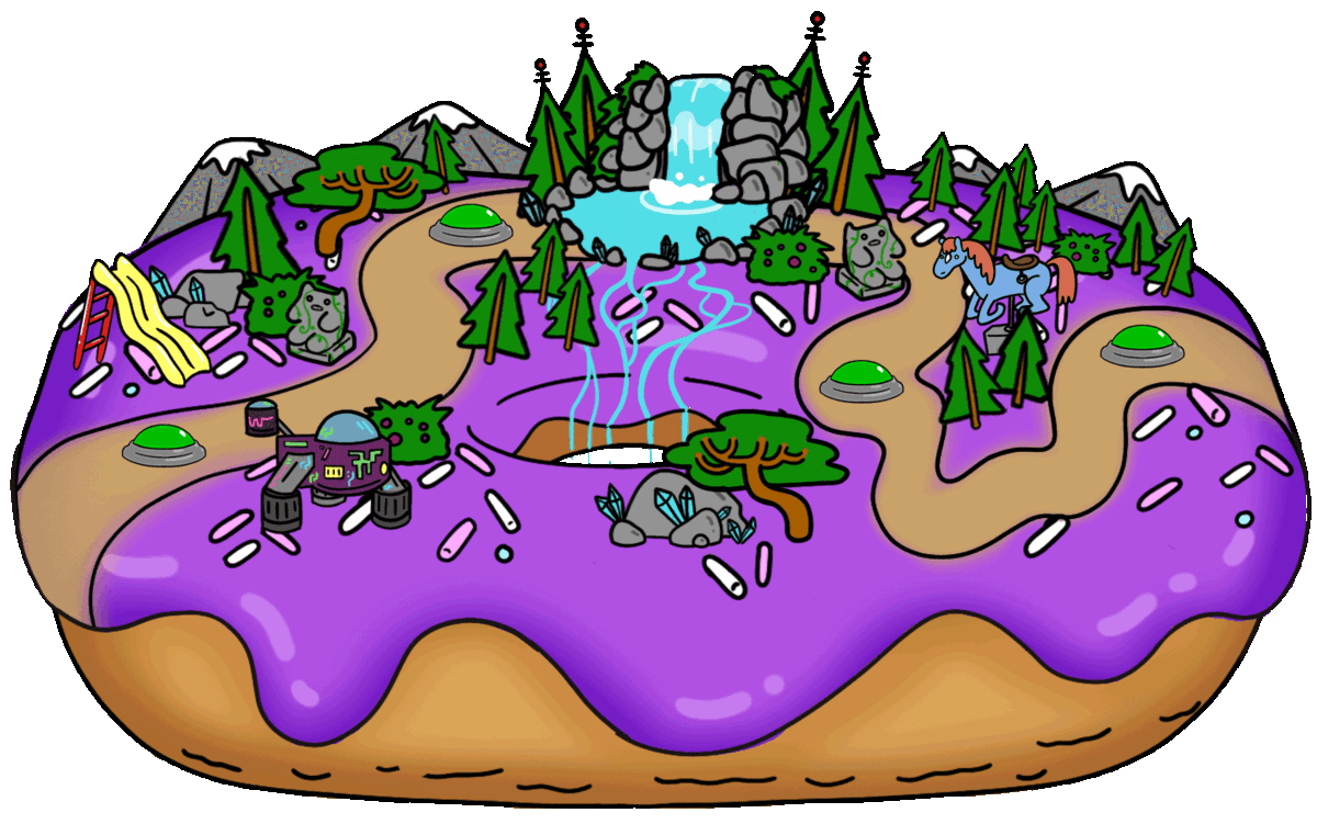 A toasty atmosphere with rugged terrain, Donut World is a vast expanse covered by purple frosting and candied bushes. Large stone statues of a cute creature adorn the sides of a winding road. As the road melts into the horizon, a range of sugar-capped mountains dominate the landscape. An enormous waterfall sits at the center of the world, with water flowing straight through the surface and into space. There is no sign of life in sight.